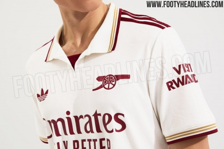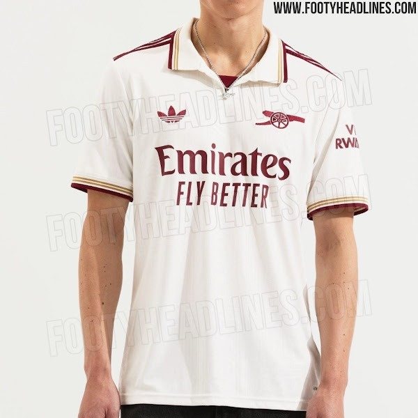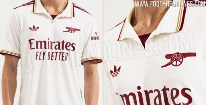 阿森纳2025-26赛季第三球衣重新采用了白色底色搭配栗色标识,以及栗色和金色的细节装饰。